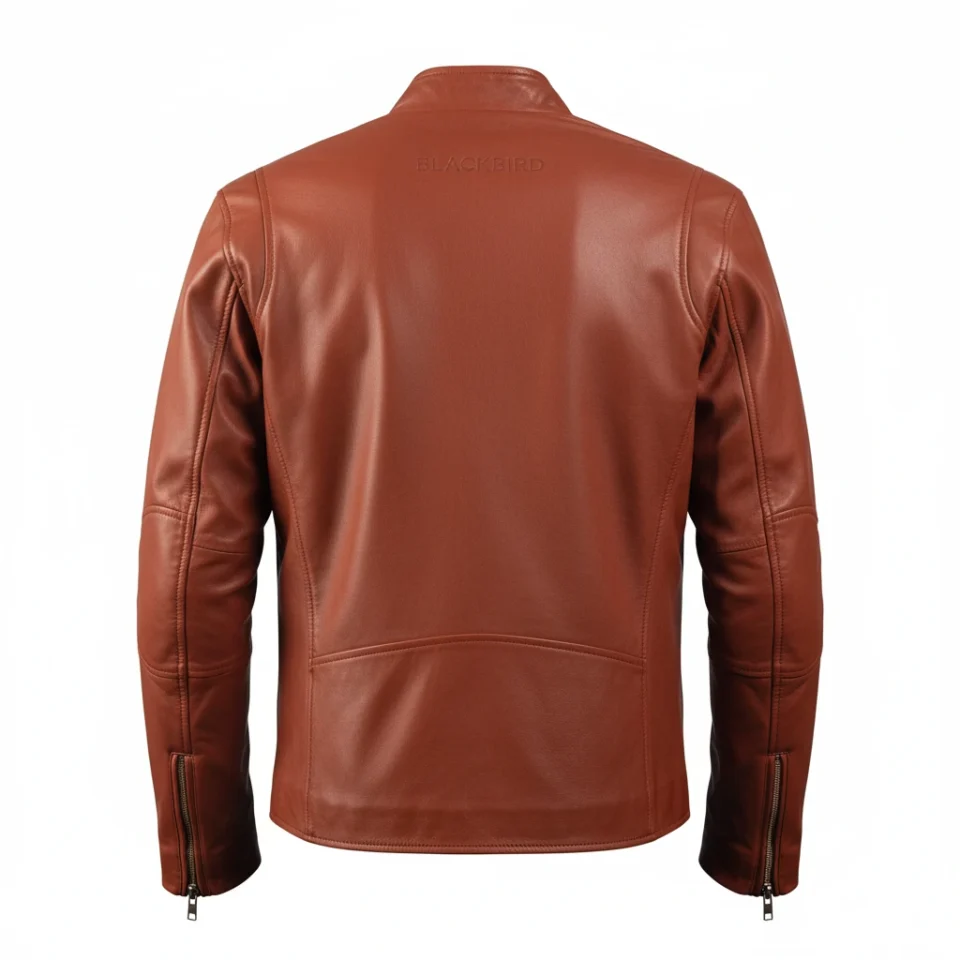 Superior craftsmanship meets rugged style. This genuine Chestnut brown leather jacket from BLACKBIRD features a tailored fit, a simple stand collar, and classic zip-up design for lasting quality and comfort.